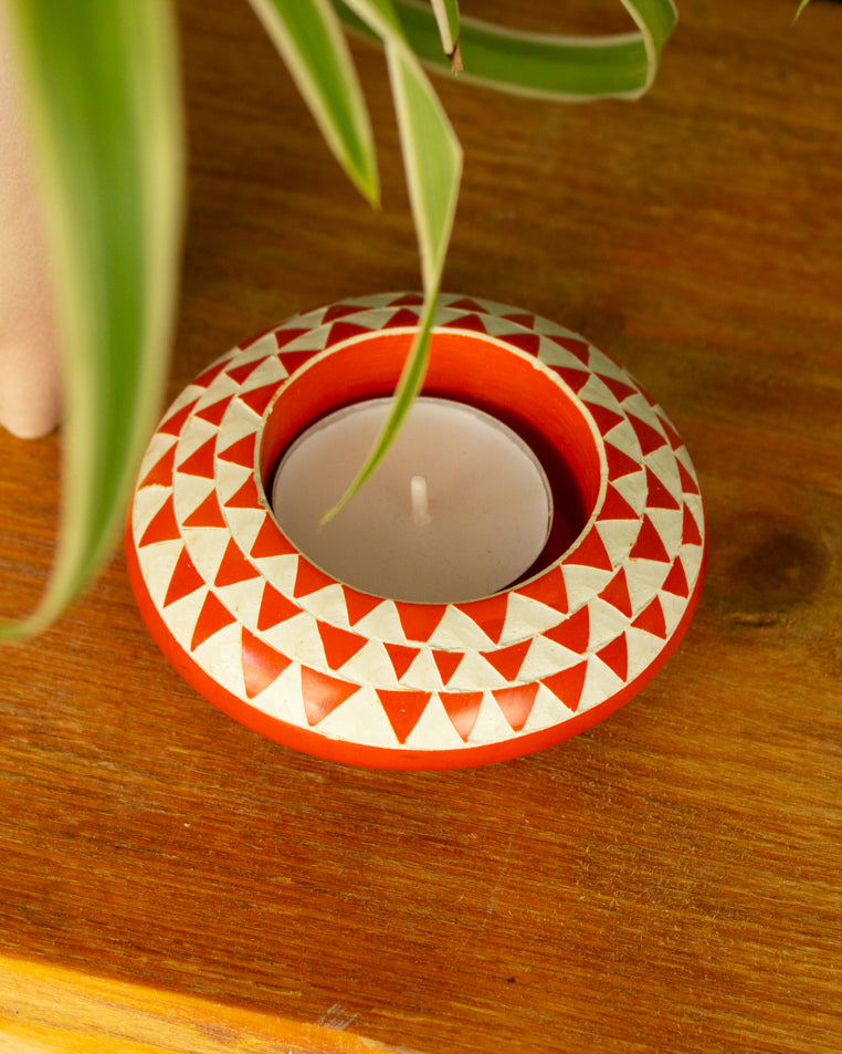 Welcome the warmth of the African sun into your home with our Kenyan hand carved tea light candle holder. Like all of our soapstone products, it has been crafted using ethically sourced material. The base has a smooth surface with walled edges, ideal for catching wax and keeping candles burning safely. Hand decorated with our signature Sun Mask pattern in a bright, zesty orange colour.