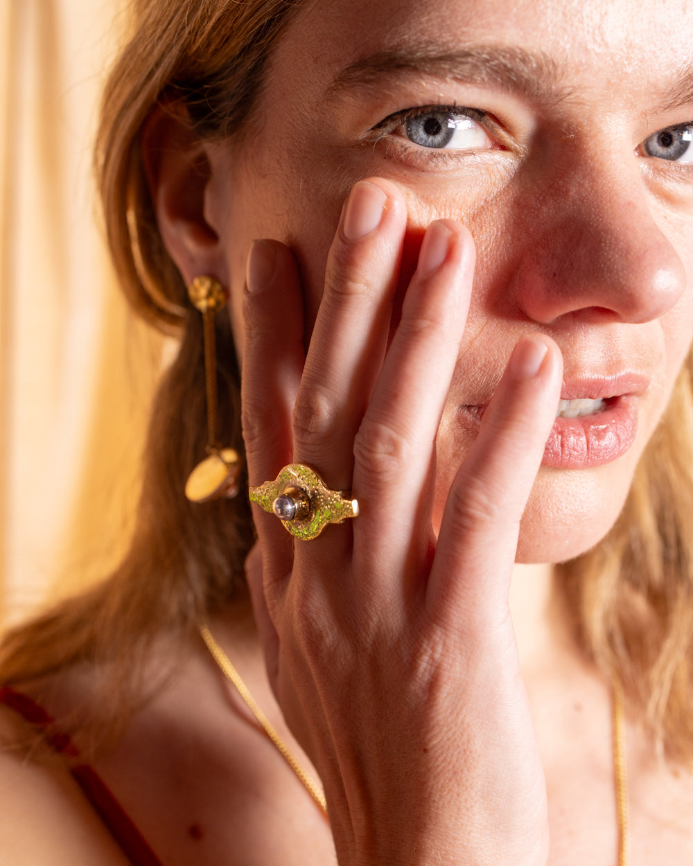 Ethically handmade in Kenya by our team of talented artisans. The brass is hand-hammered to give it a beautiful shimmer, making it an eye-catching accessory. The organic hammered texture and smooth aluminium ‘pearl’ makes this ring a wearable work of art.