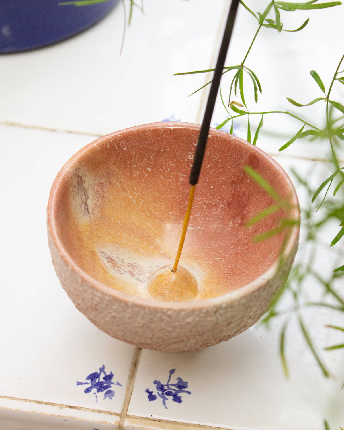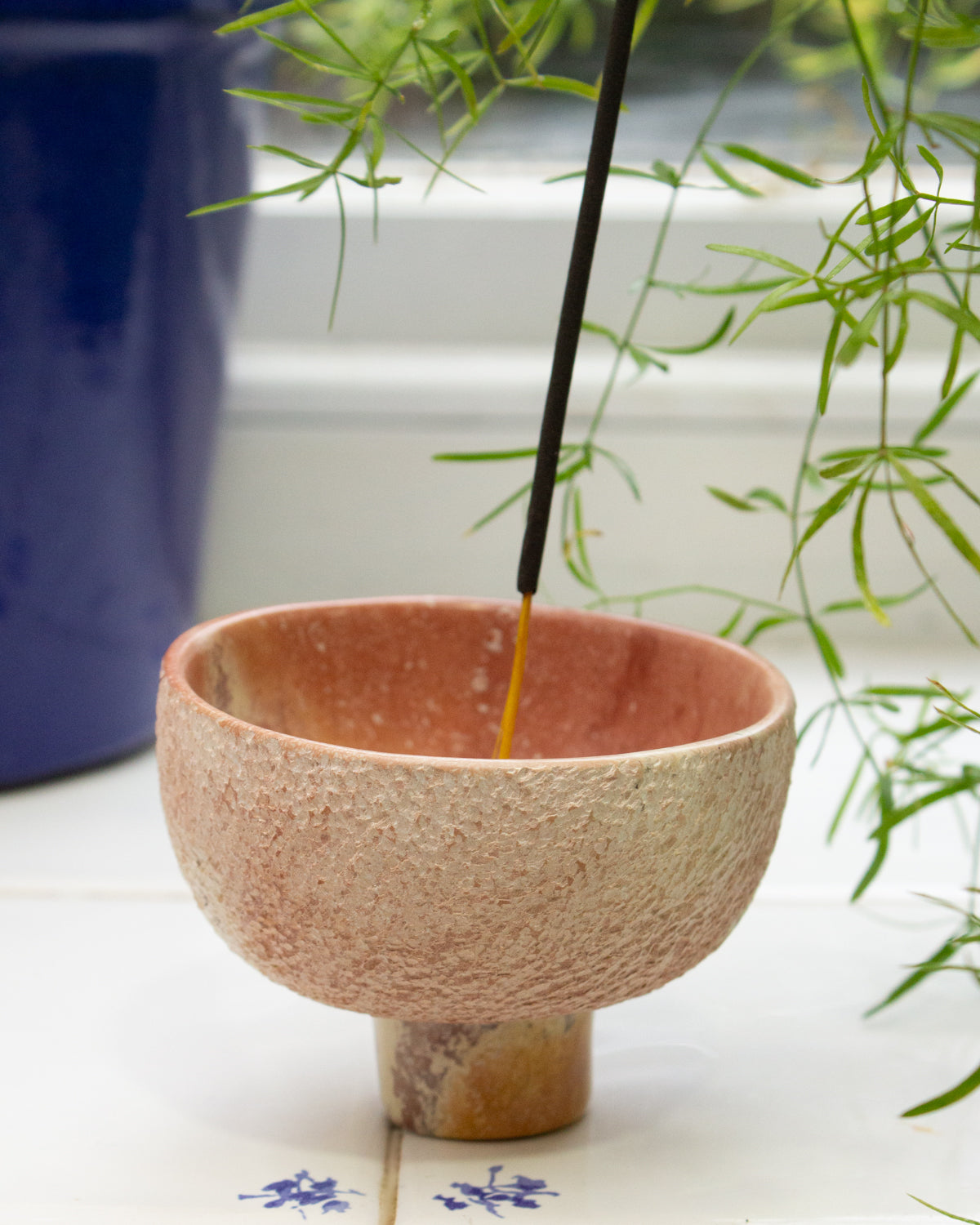 Expertly crafted from sustainably sourced Kenyan soapstone, this elevated incense bowl features a tactile, textured exterior contrasted with a smooth interior. The pedestal base gives it a contemporary silhouette while catching falling ash, making it both practical and stylish.