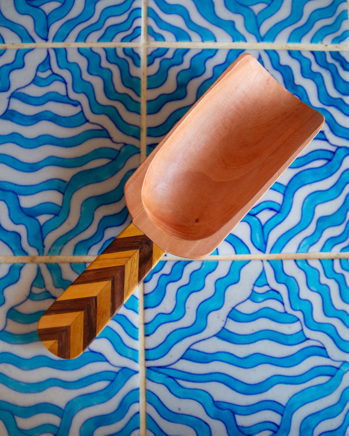 The sturdy handle features a distinctive mosaic inlay, blending traditional craftsmanship with contemporary design. Finished to be smooth and food-safe, the scoop’s broad bowl and ergonomic handle make it both practical and stylish.