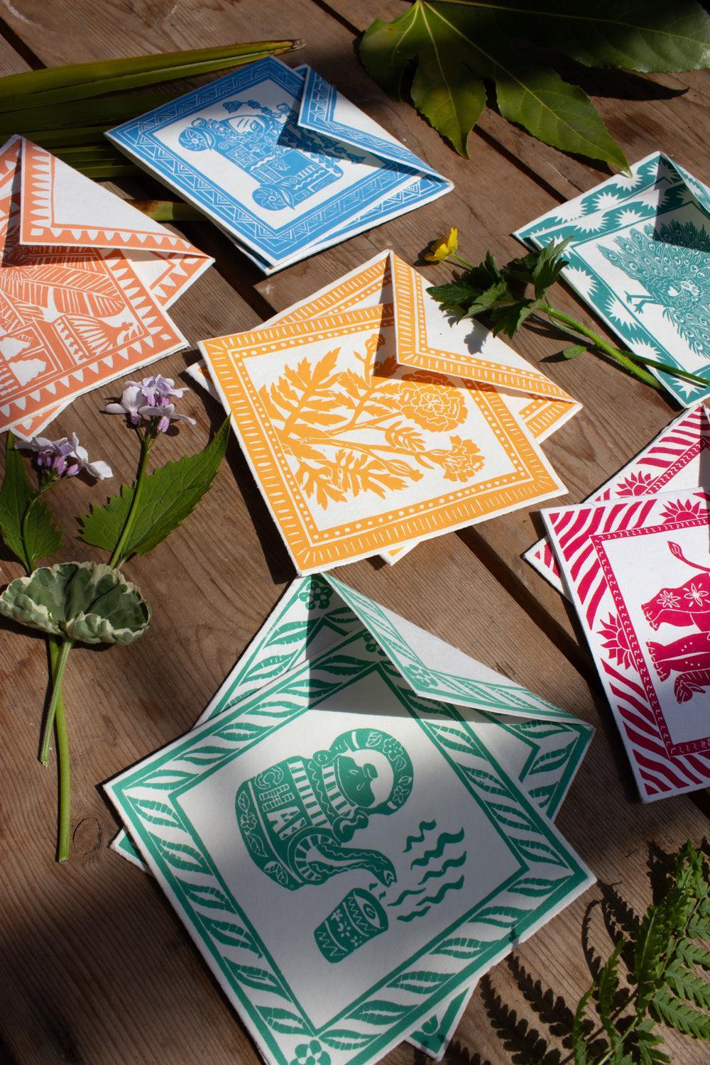 Handmade by expert artisans in India using sustainable recycled cotton paper. Our signature greetings cards are hand screen-printed with our original pattern and pairs beautifully with our stunning gift wrap.
