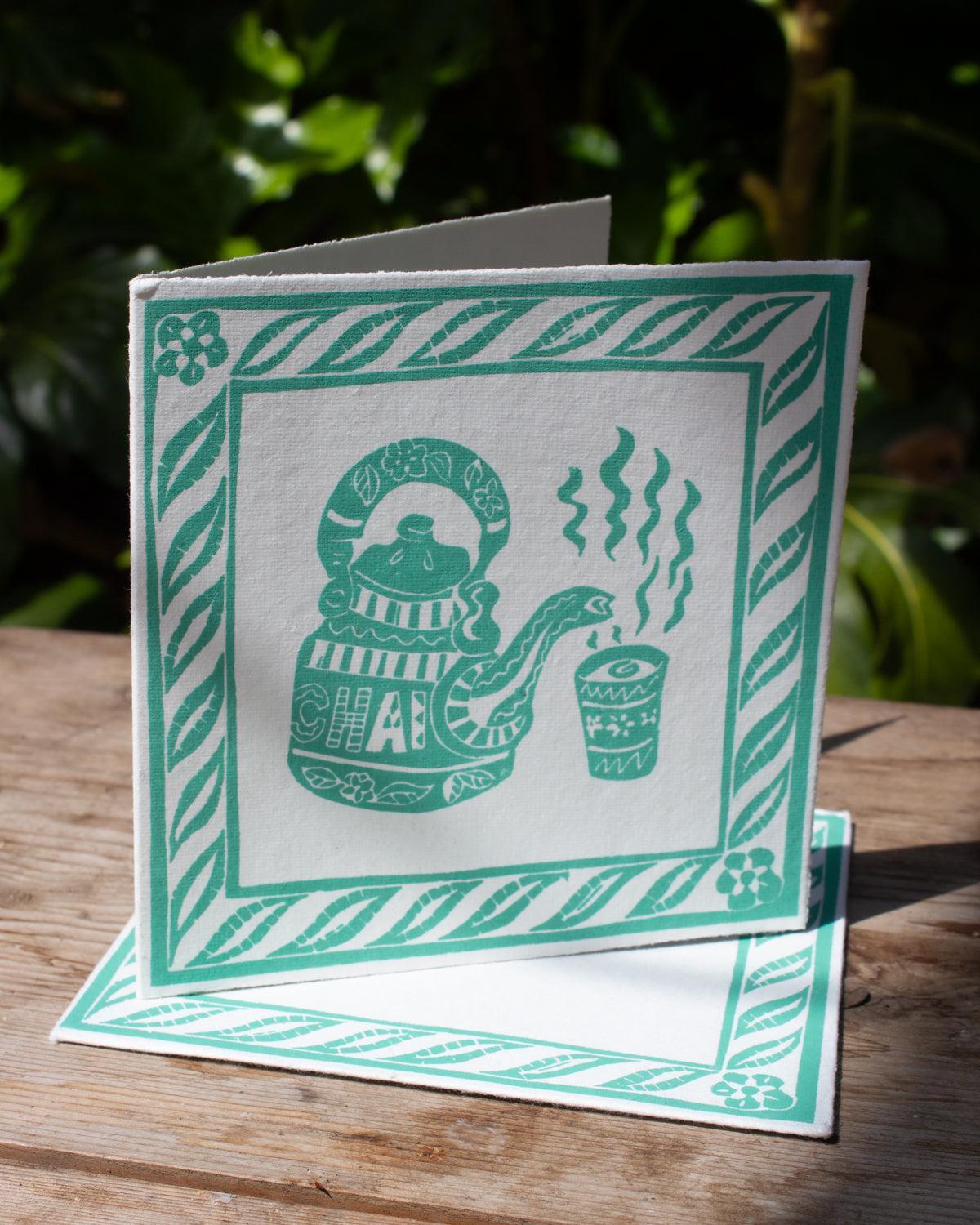 Luxury and designer greetings card, hand-illustrated and linocut by Amy Fleuriot-Reade, our co-founder. This chai pot greetings card in grassy green was inspired by the warmth of Indian hospitality. Designed for everyone, this greetings card is an excellent way to make a loved one’s day on any occasion.