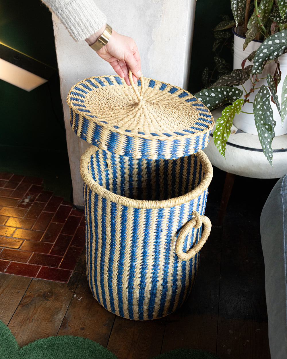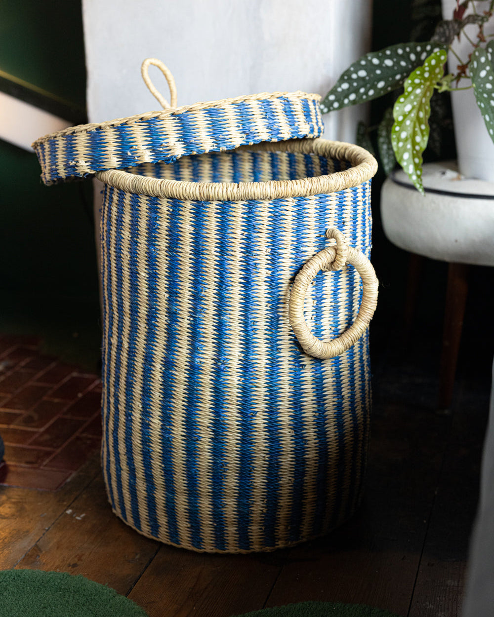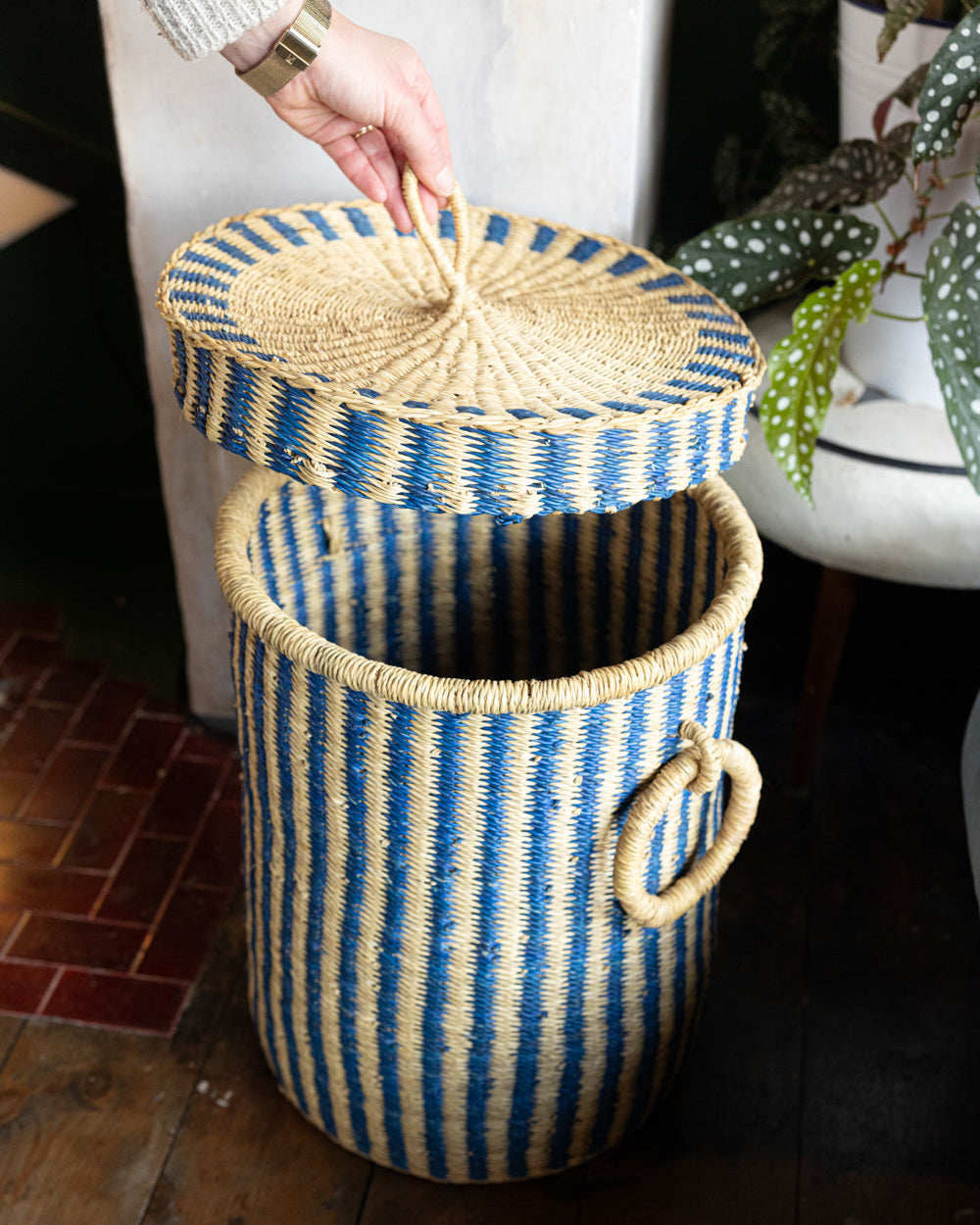 Ghanaian Hand Woven Laundry Basket with Lid and Handles 'Ocean Blue Stripes'