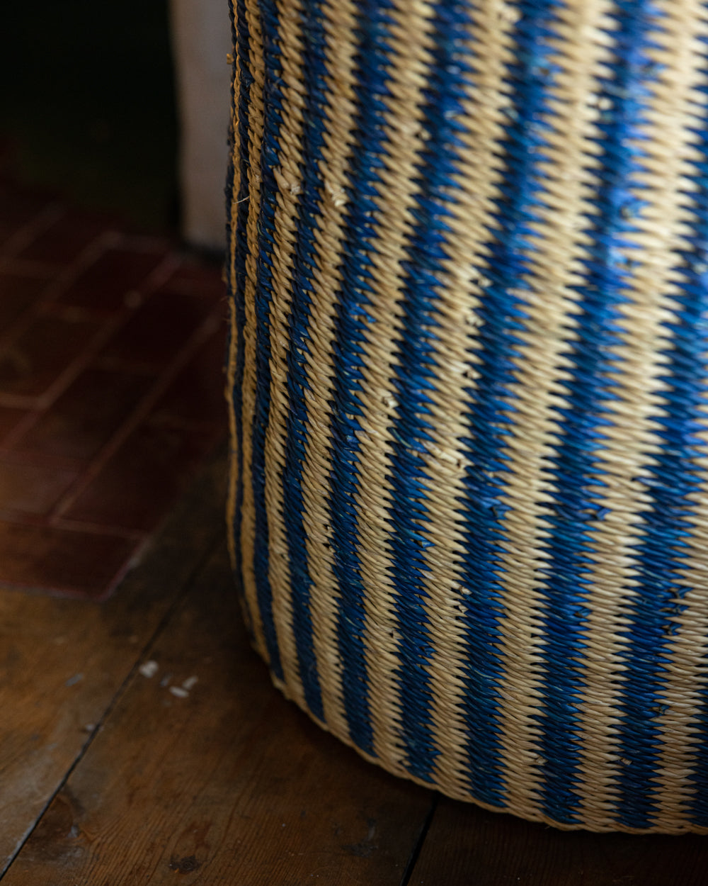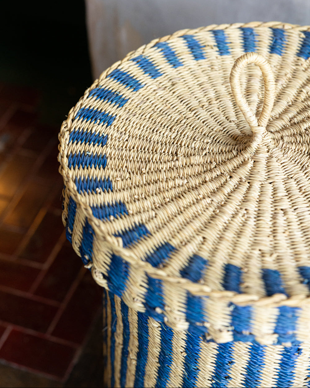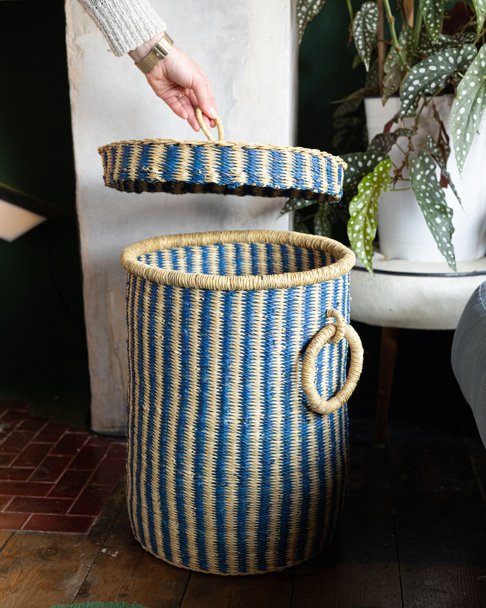 Ghanaian Hand Woven Laundry Basket with Lid and Handles 'Ocean Blue Stripes'
