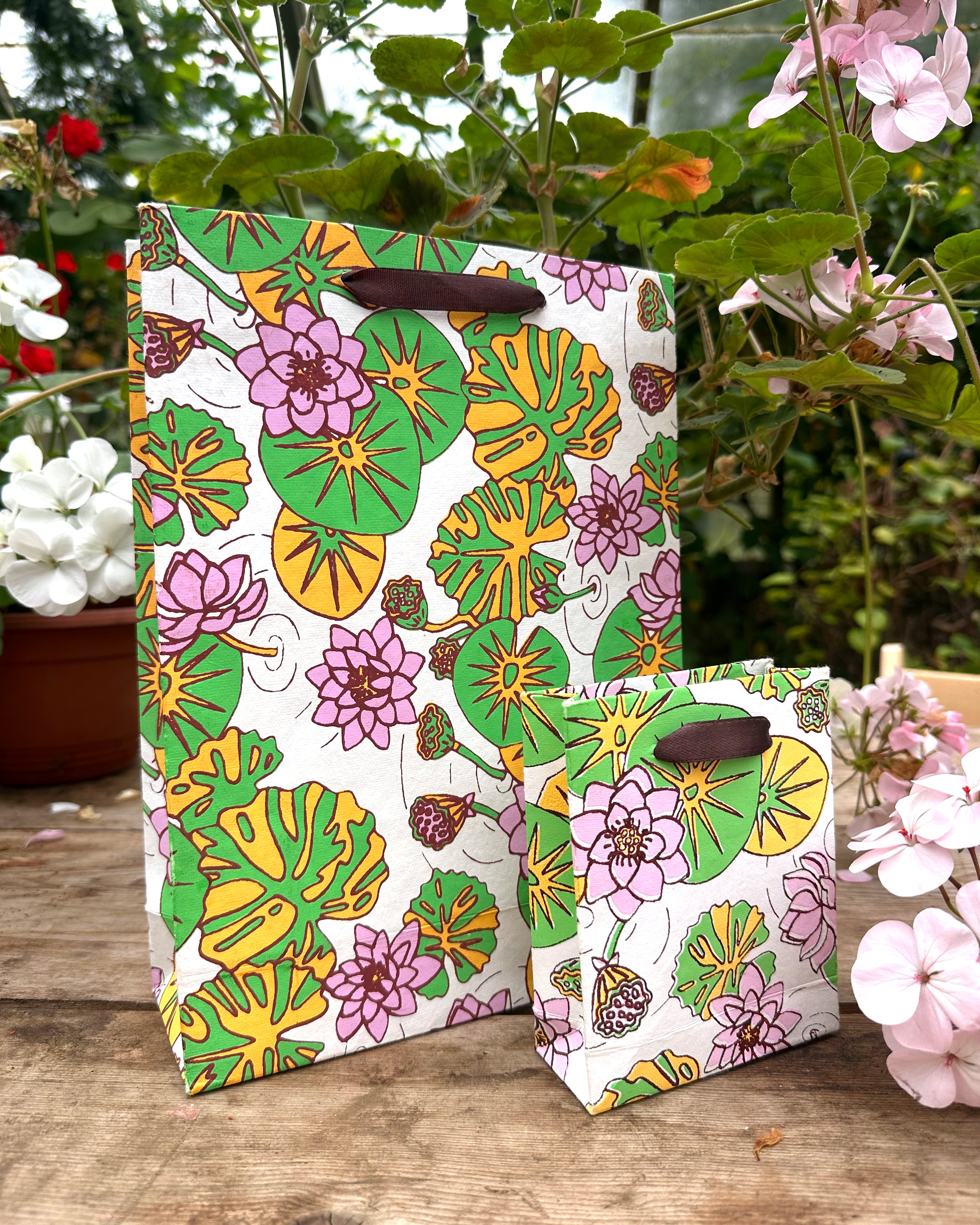 Ethical and sustainable decorative paper gift bag. AARVEN's Water Lilies design is sure to brighten up any occasion.
