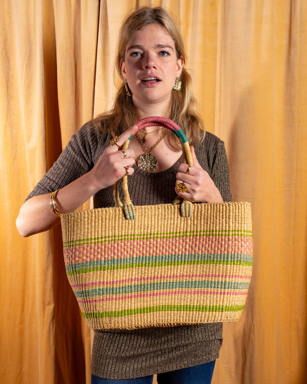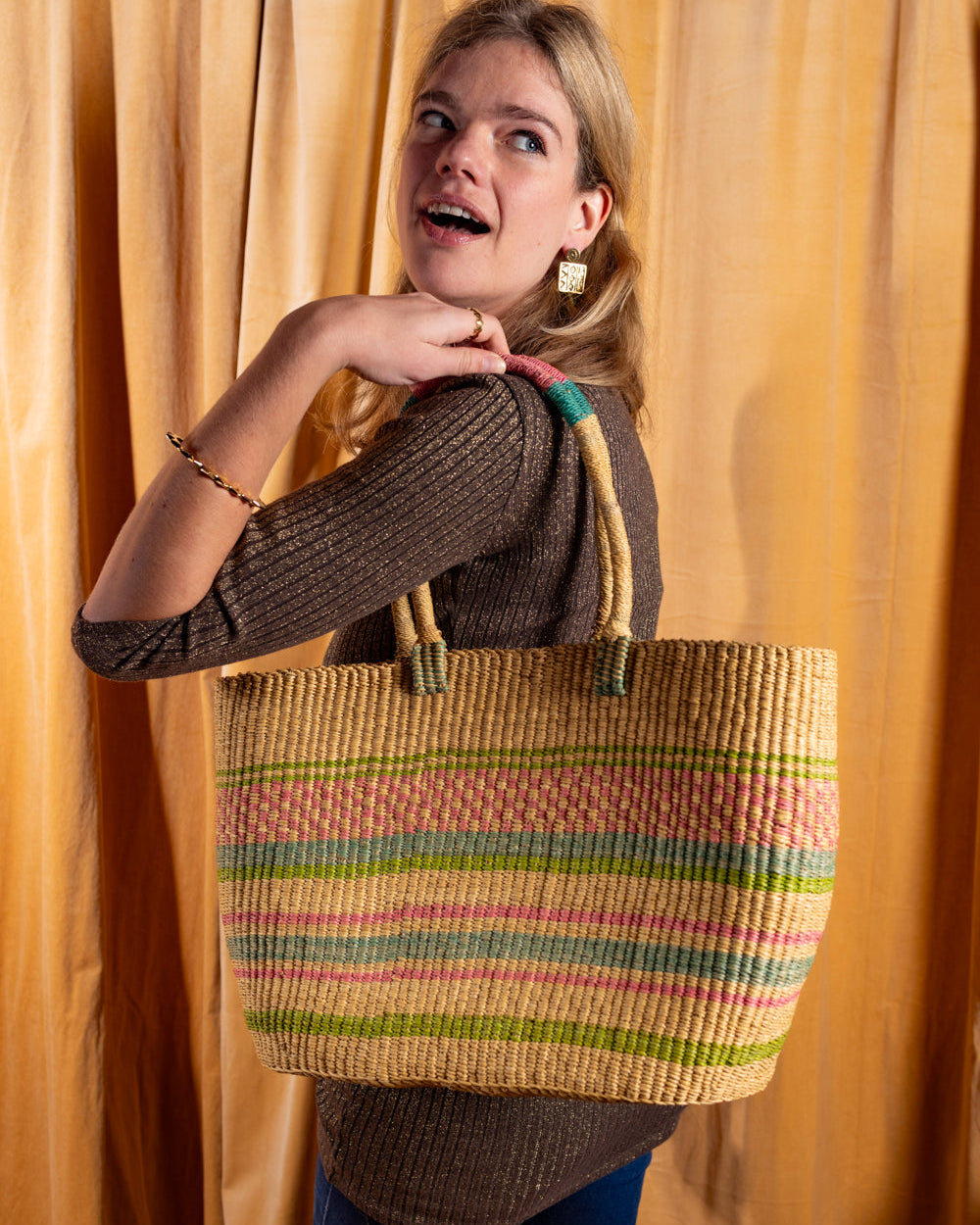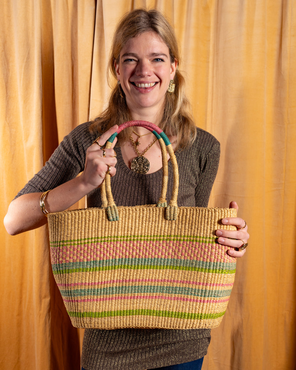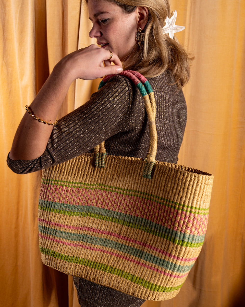 Ethically produced using natural materials. The vibrant, colourful design makes it an excellent addition to any room or outfit. The handles are ergonomic for a comfortable hold. The material is lightweight, allowing you to carry it with ease.