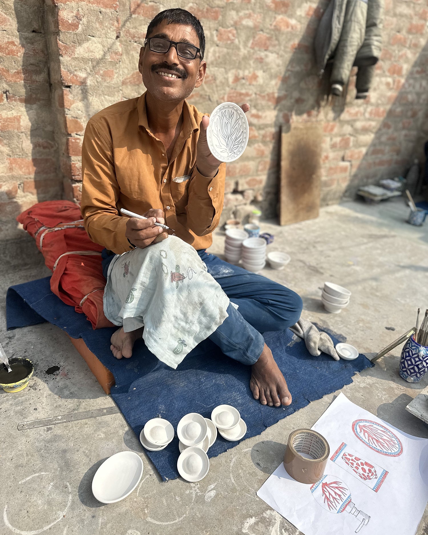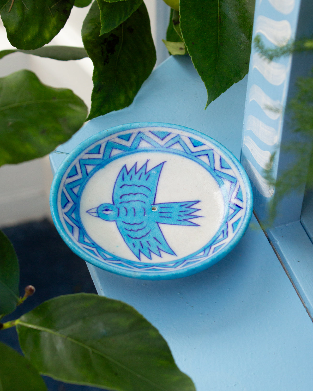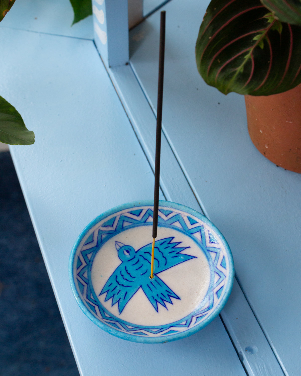 Each incense dish is made using the centuries-old Jaipur Blue Pottery technique, celebrated for its rich cyan glazes and eco-conscious craftsmanship. These methods were passed down over 10 generations. Each dish is a little different, giving it that beautiful human touch. Read more about our artisans here.