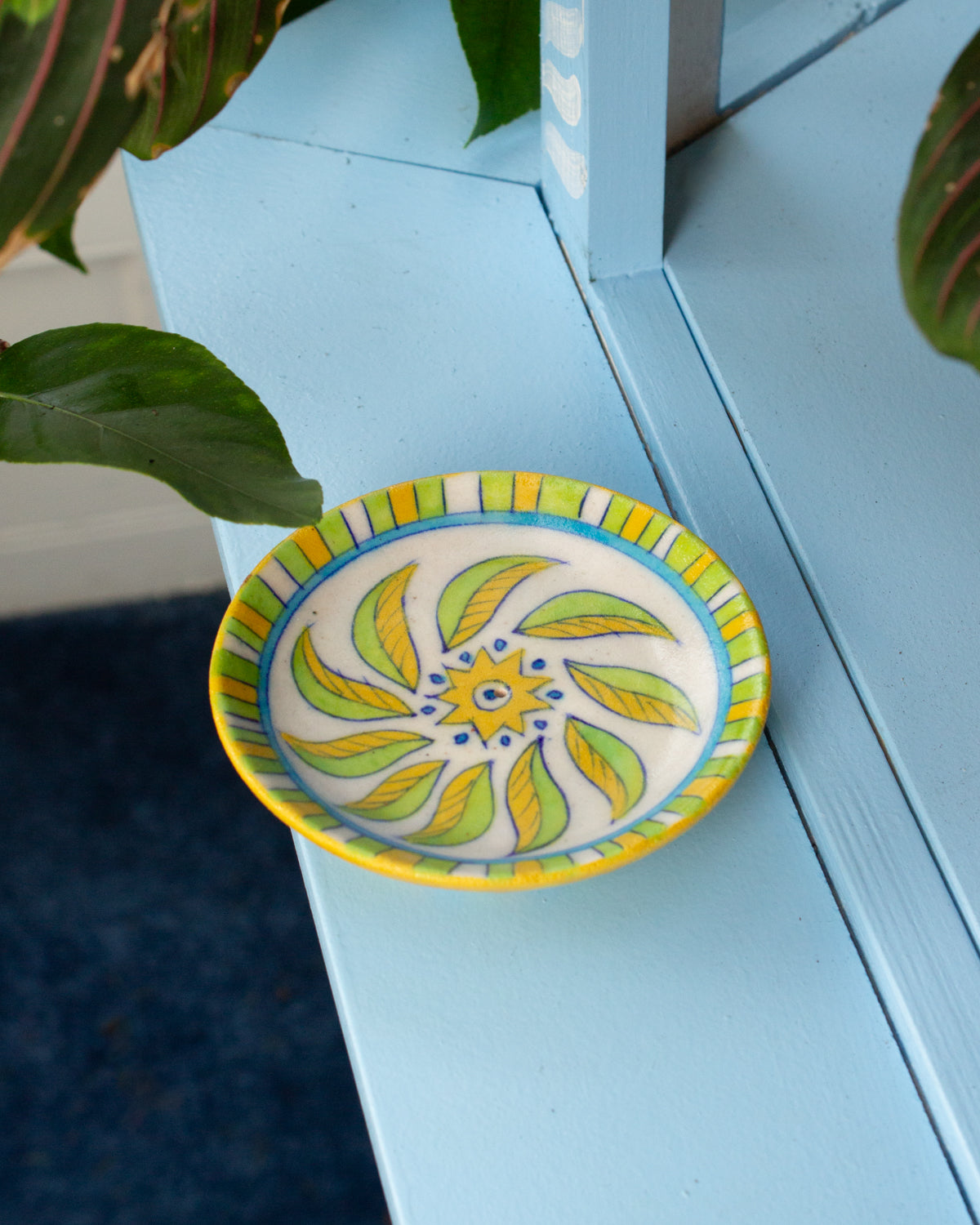 Bring vibrant artistry into your home with AARVEN’s Sunshine Incense Dish. Handcrafted by skilled artisans in Jaipur, this unique incense holder features a sunny botanical design and contemporary striped edging.